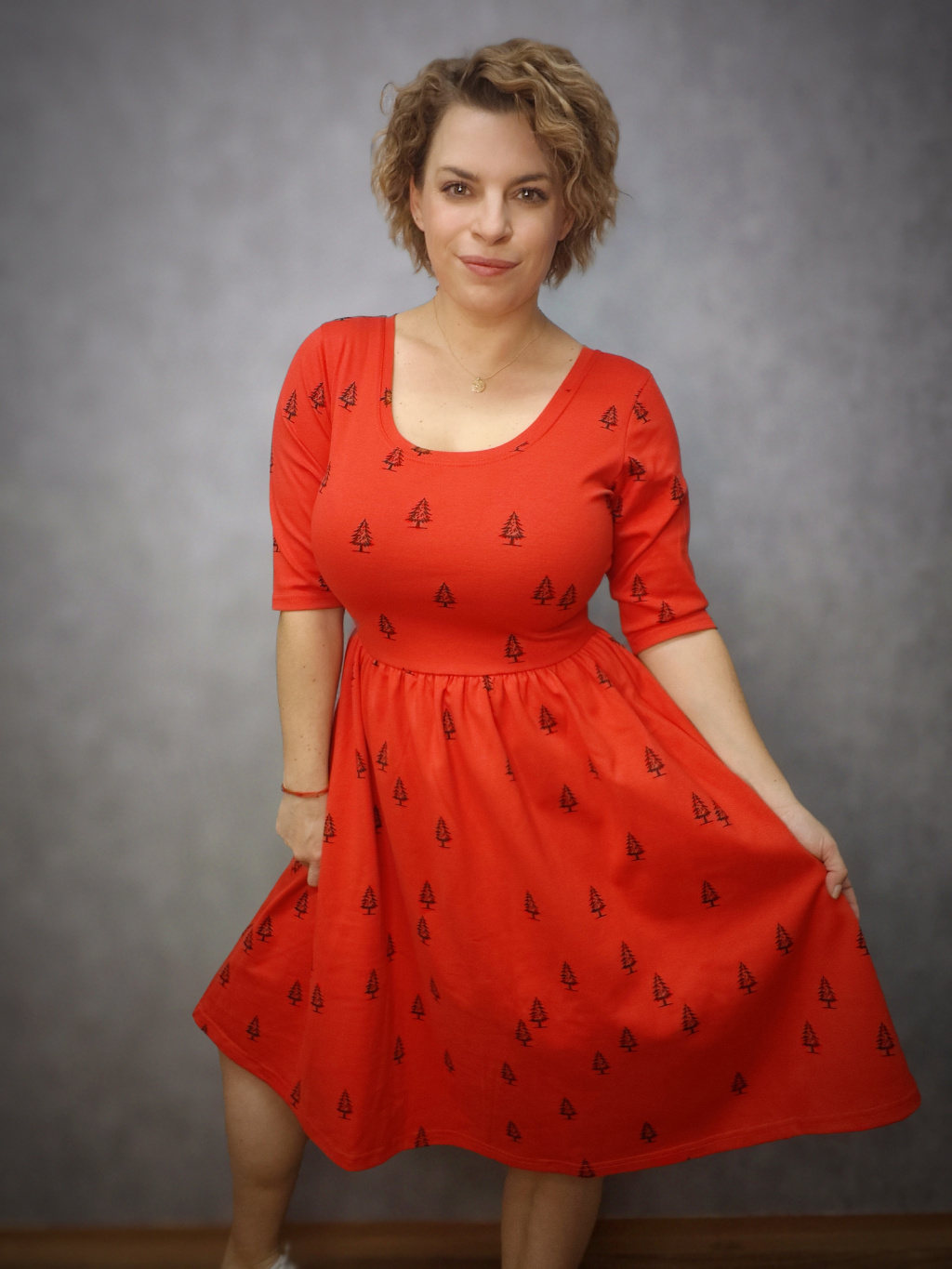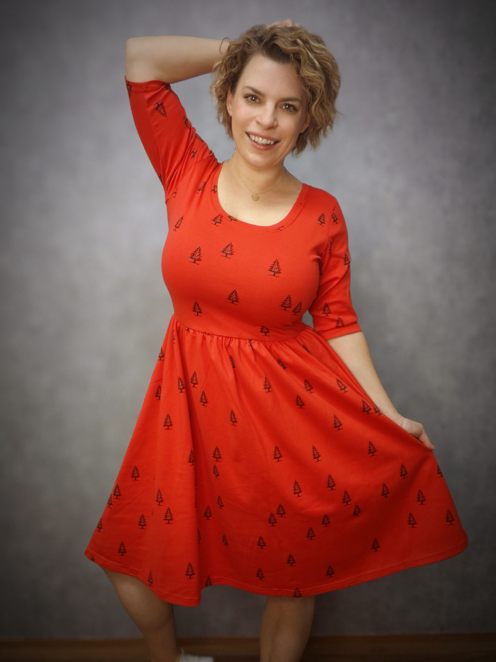 Šaty mají polodlouhý rukáv. Výstřih mají šaty kulatý a nesmí chybět praktické kapsy, které jsou důmyslně skryté v bočním švu, avšak nijak nerozšiřují. Úzký živůtek a široká nabraná sukně krásně zvýrazní ženskou siluetu a skryje menší bříško.