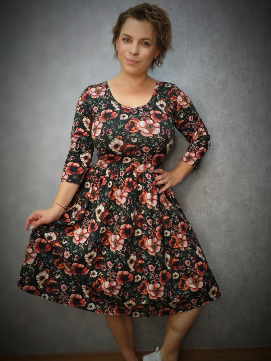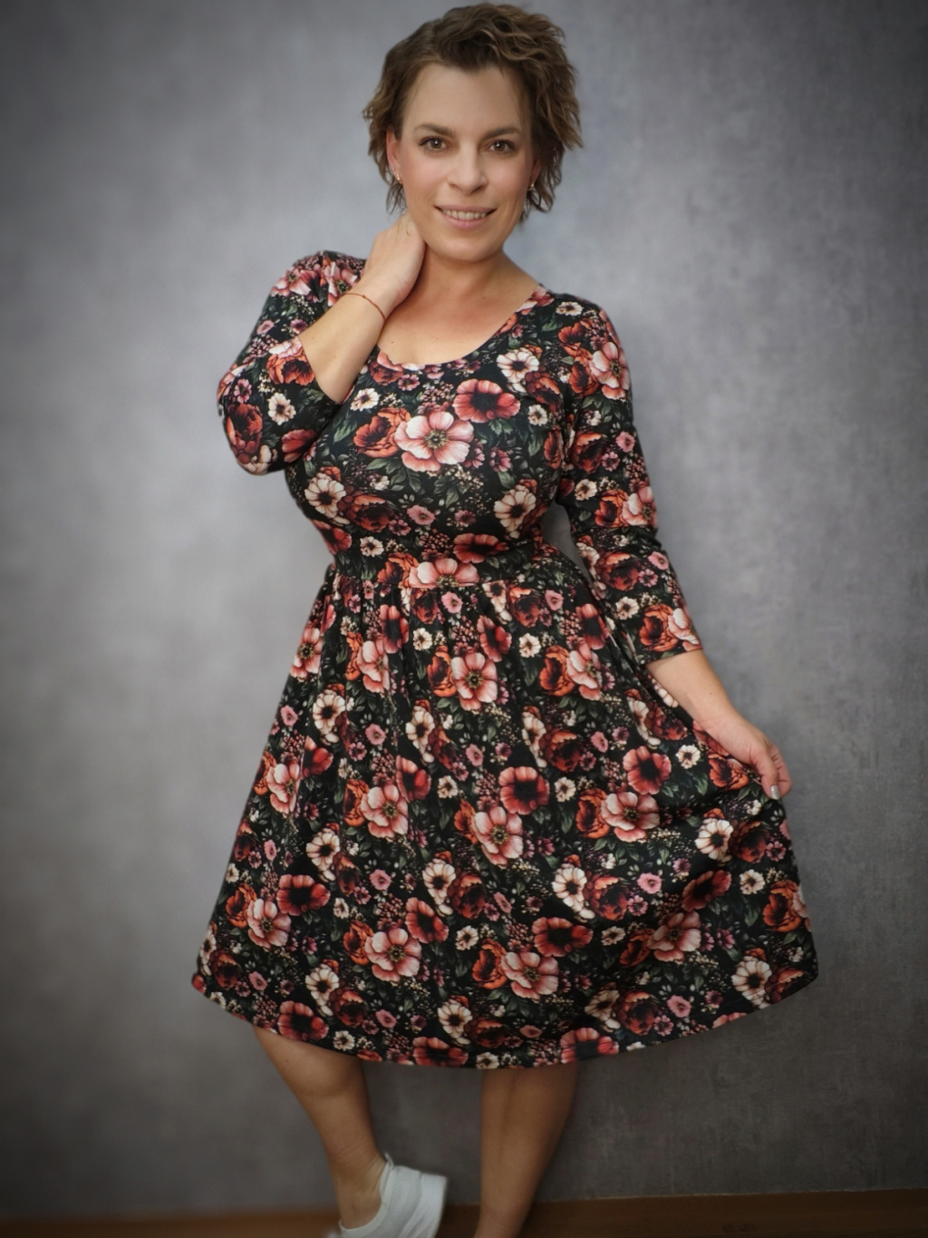 Šaty mají 3/4 rukáv. Výstřih mají šaty kulatý a nesmí chybět praktické kapsy, které jsou důmyslně skryté v bočním švu, avšak nijak nerozšiřují. Úzký živůtek a široká nabraná sukně krásně zvýrazní ženskou siluetu a skryje menší bříško.