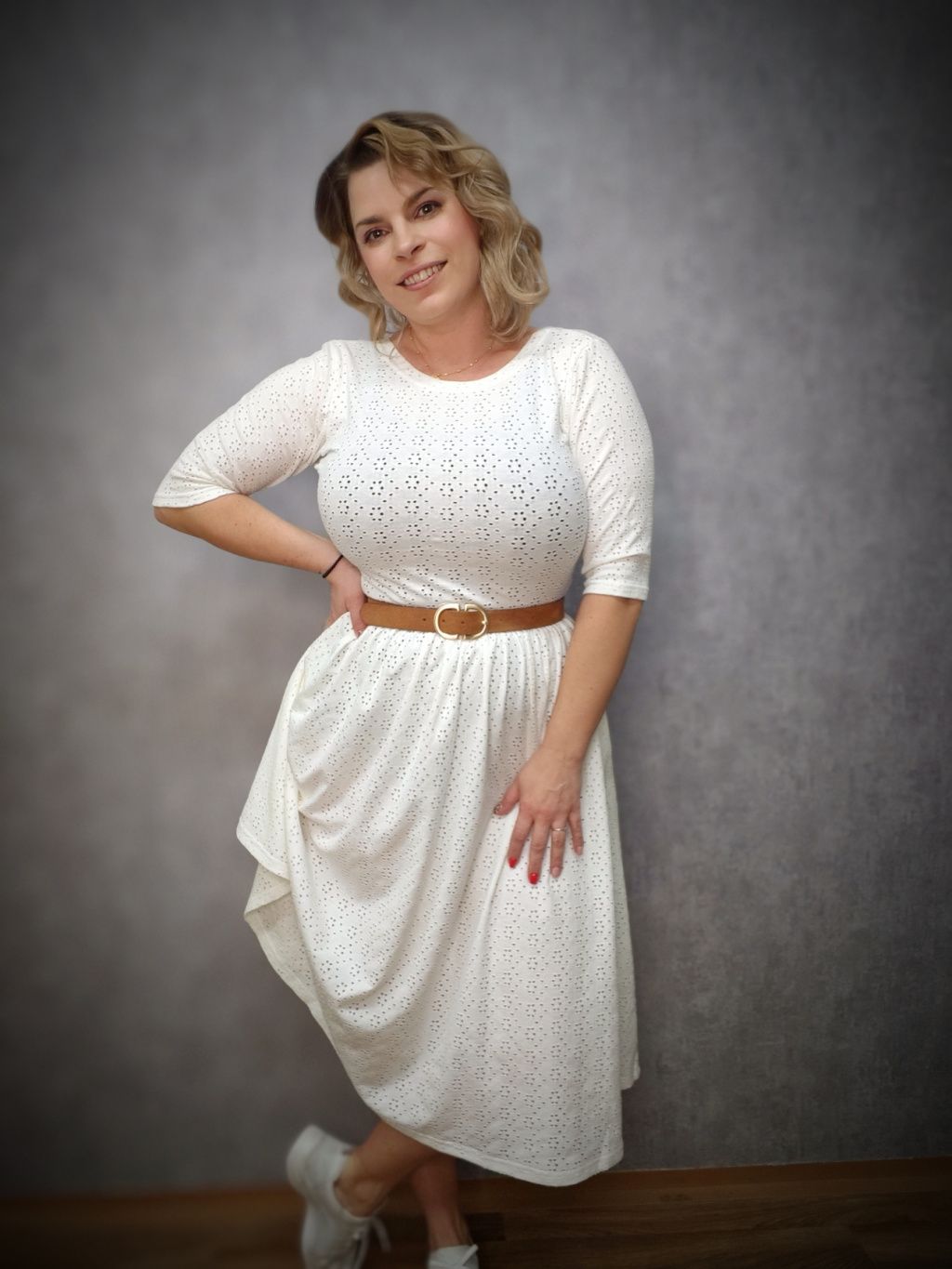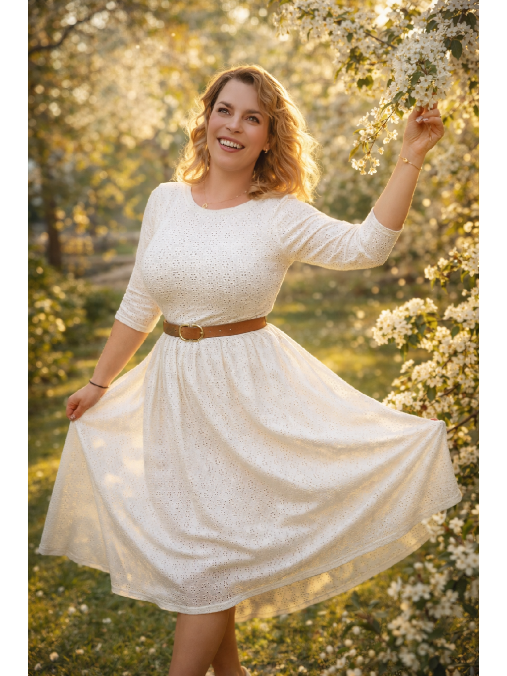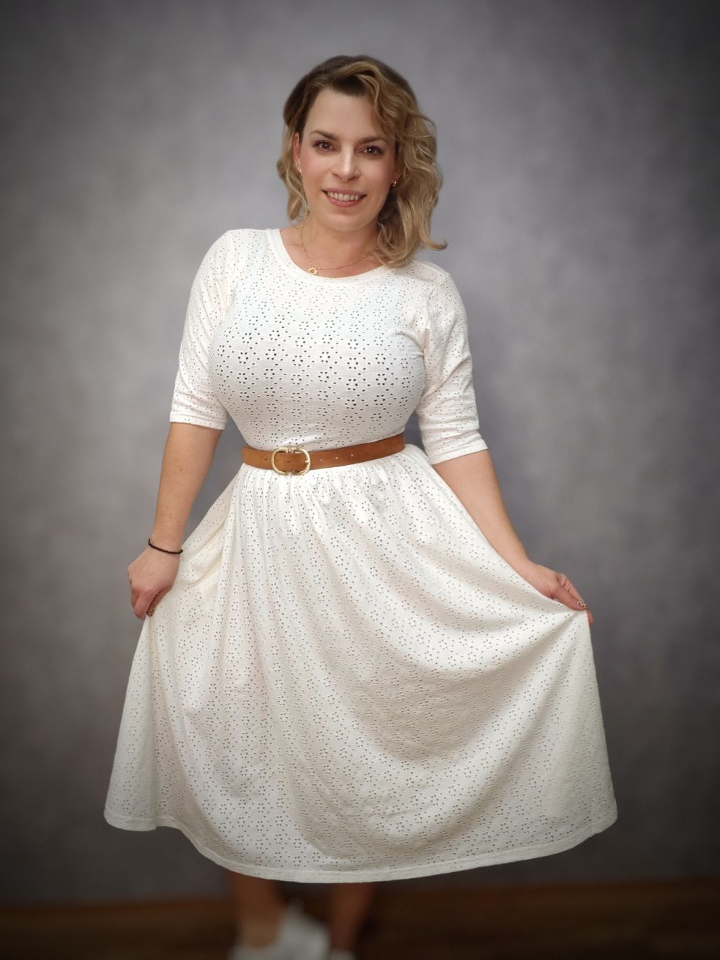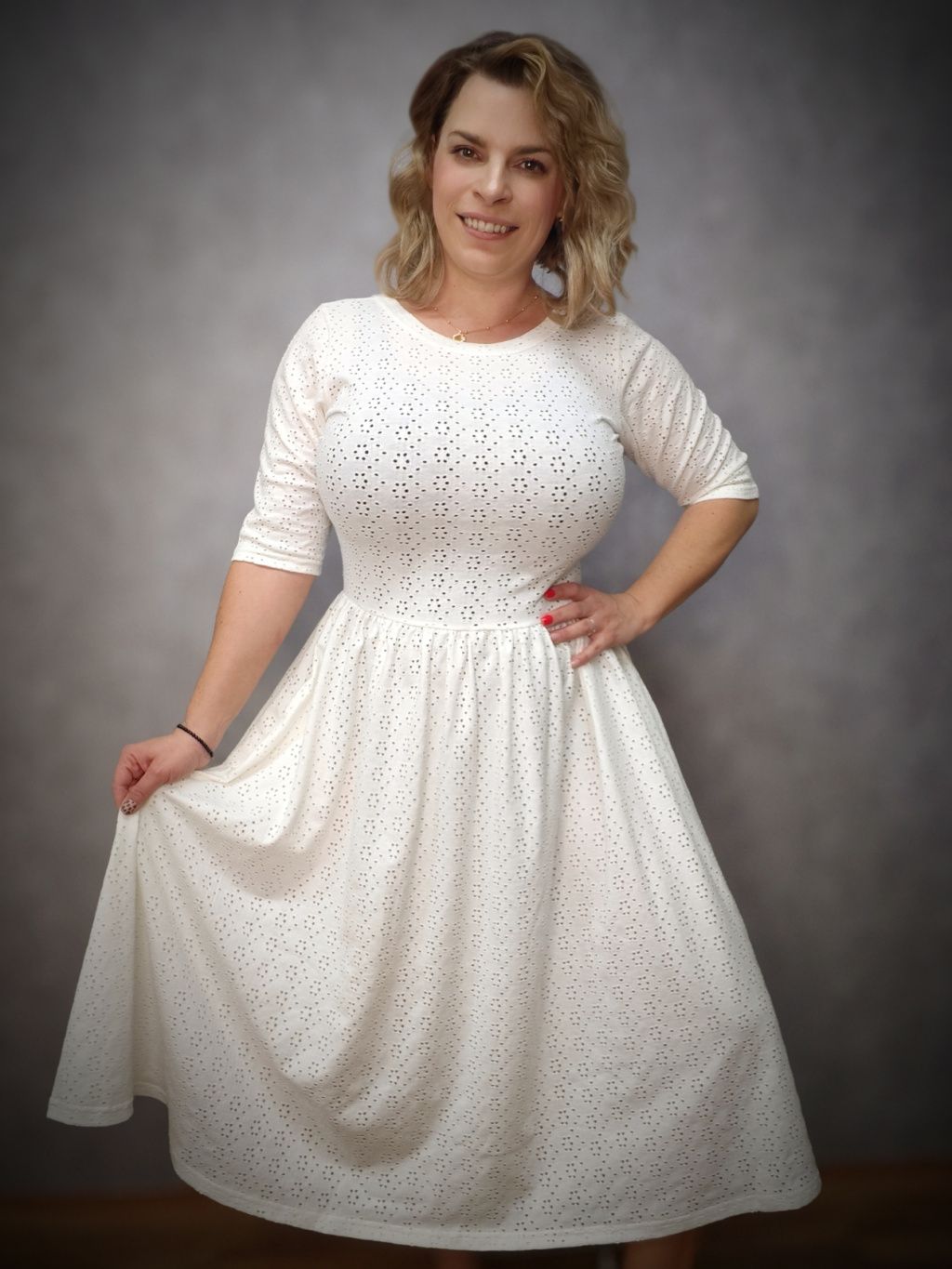 Střih vychází z oblíbených a vyzkoušených BeChic šatů. Na rozdíl od nich mají delší a bohatší sukni. Délka je cca do půli lýtek. Živůtek je stejný. Úplet je s vysekávanými dírkami, bez spodničky. Můžete doplnit černým body a punčochami, či kombiné.