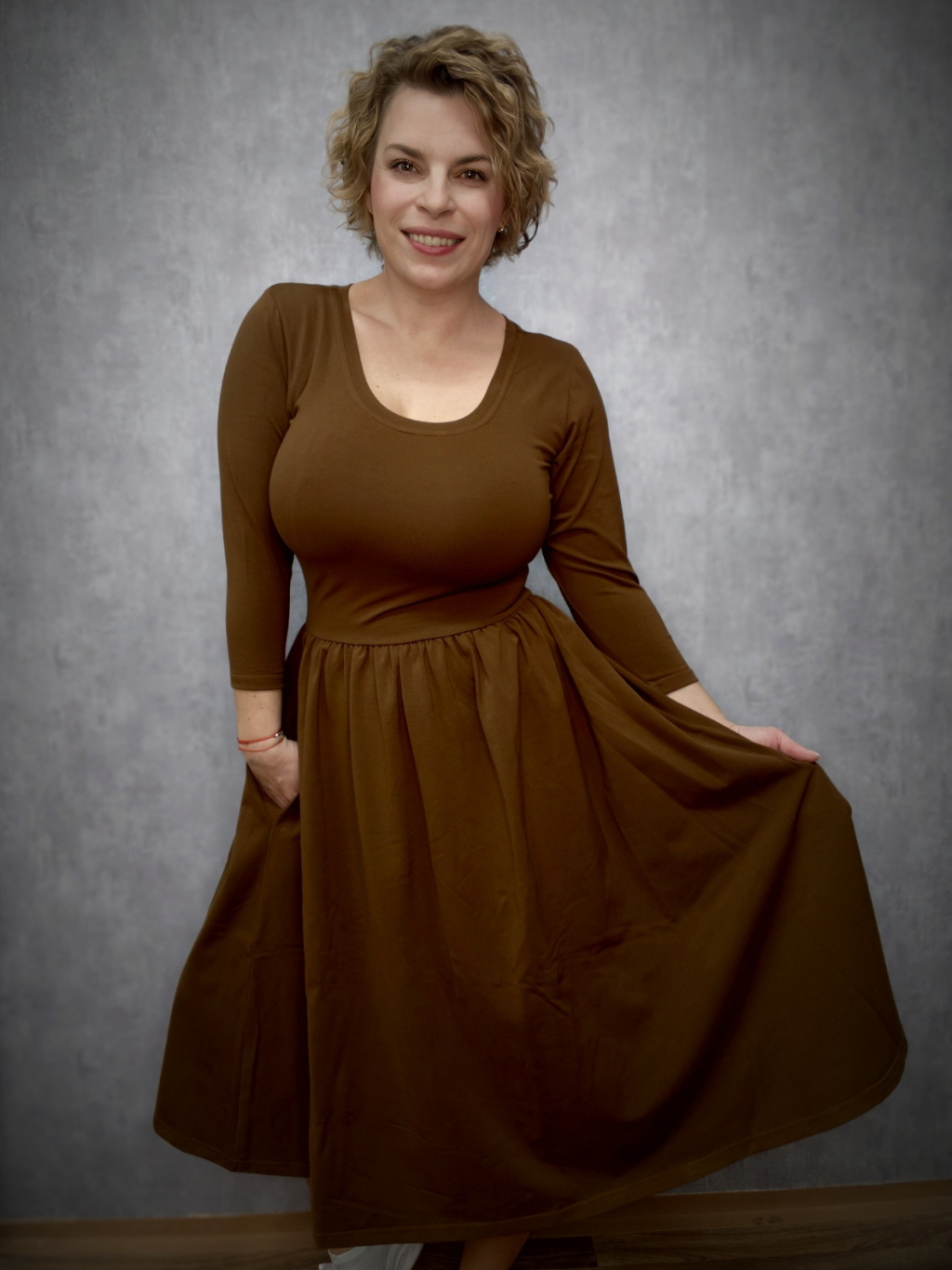 Šaty mají 3/4 rukáv. Výstřih kulatý a praktické kapsy, které jsou důmyslně skryté v bočním švu, avšak nijak nerozšiřují. Úzký živůtek a široká nabraná sukně krásně zvýrazní ženskou siluetu a skryje menší bříško. Tyto jsem ozvláštnila výstřihem na zádech.