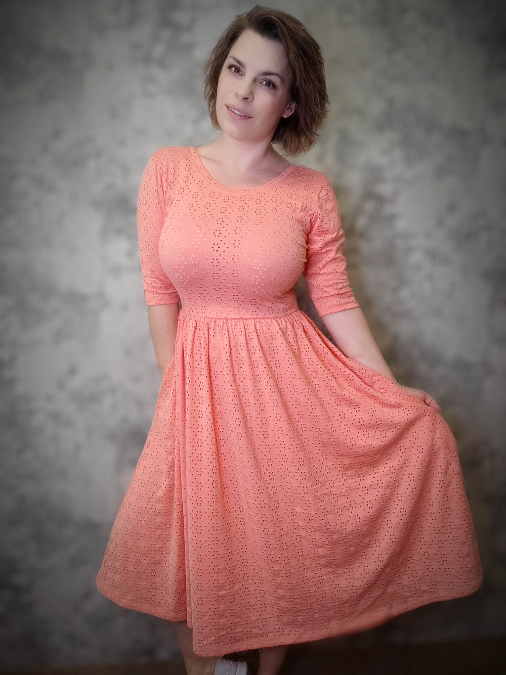 Střih vychází z oblíbených a vyzkoušených BeChic šatů. Na rozdíl od nich mají delší a bohatší sukni. Délka je cca do půli lýtek. Živůtek je stejný. Úplet je s vysekávanými dírkami, bez spodničky. Můžete doplnit černým body a punčochami, či kombiné.