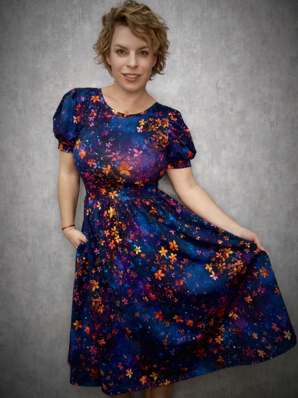 Šaty mají krátký nabíraný rukáv. Výstřih kulatý a praktické kapsy, které jsou důmyslně skryté v bočním švu, avšak nijak nerozšiřují. Úzký živůtek a široká nabraná sukně krásně zvýrazní ženskou siluetu a skryje menší bříško. Tyto jsem ozvláštnila větším výstřihem na zádech.
