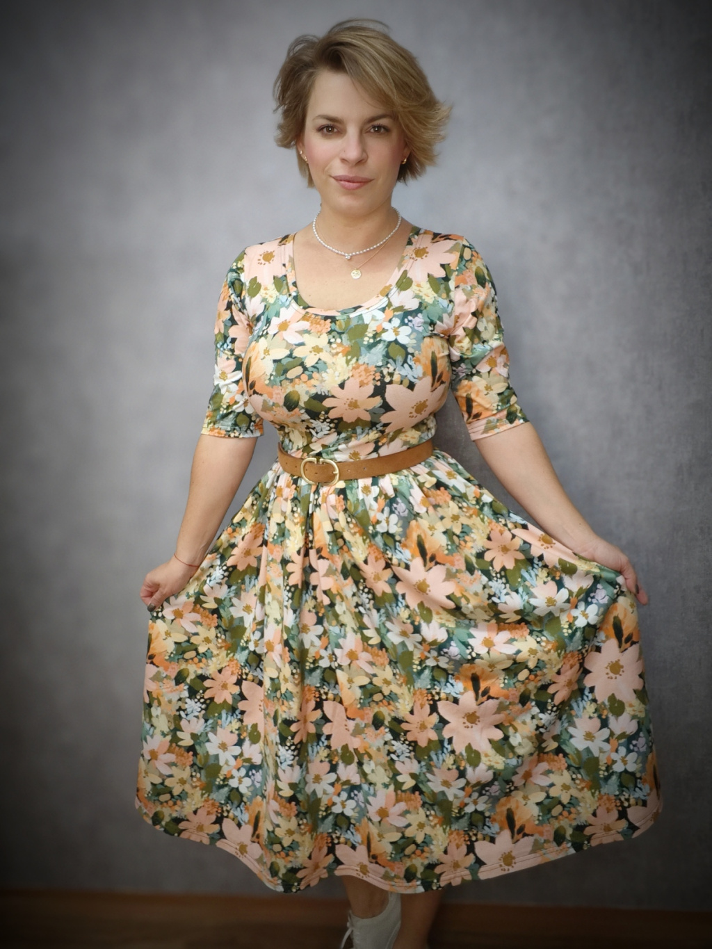 Střih vychází z oblíbených a vyzkoušených BeChic šatů. Na rozdíl od nich mají delší a bohatší sukni. Délka je cca do půli lýtek. Živůtek je stejný.