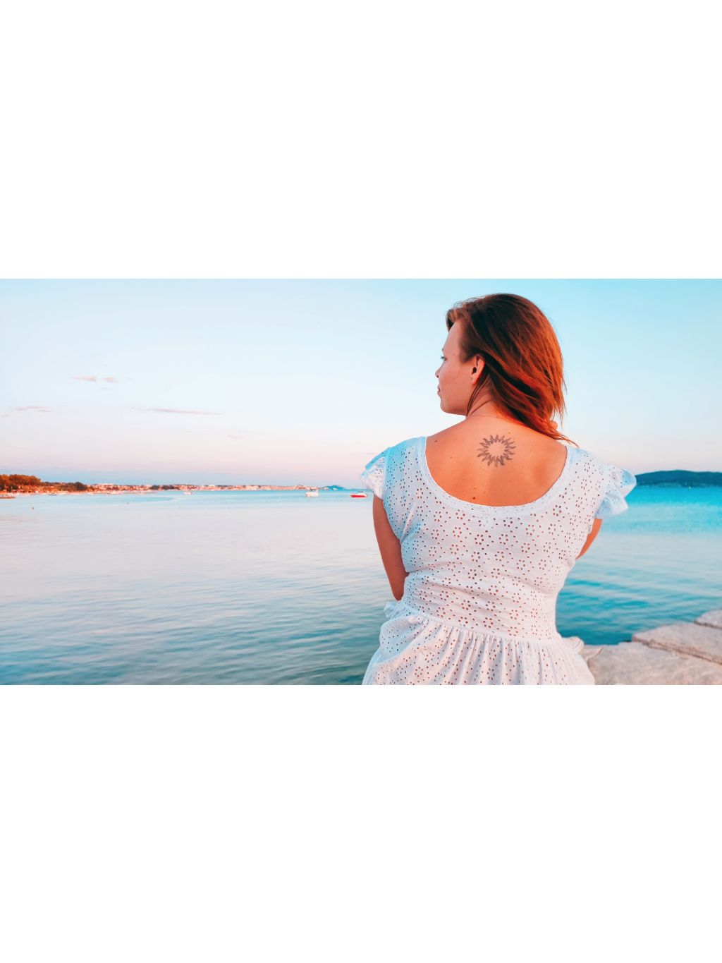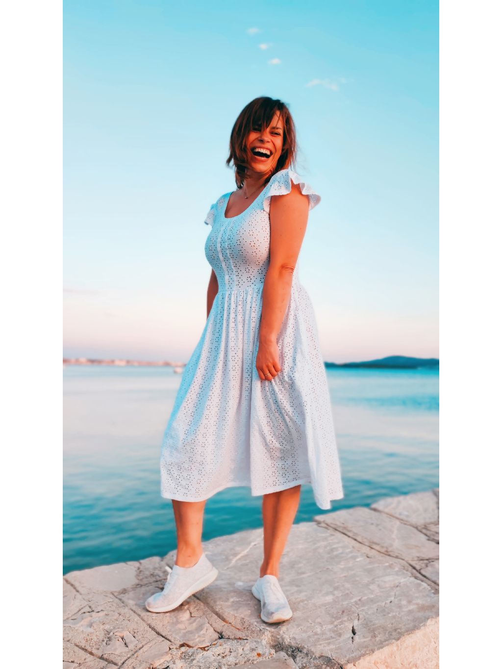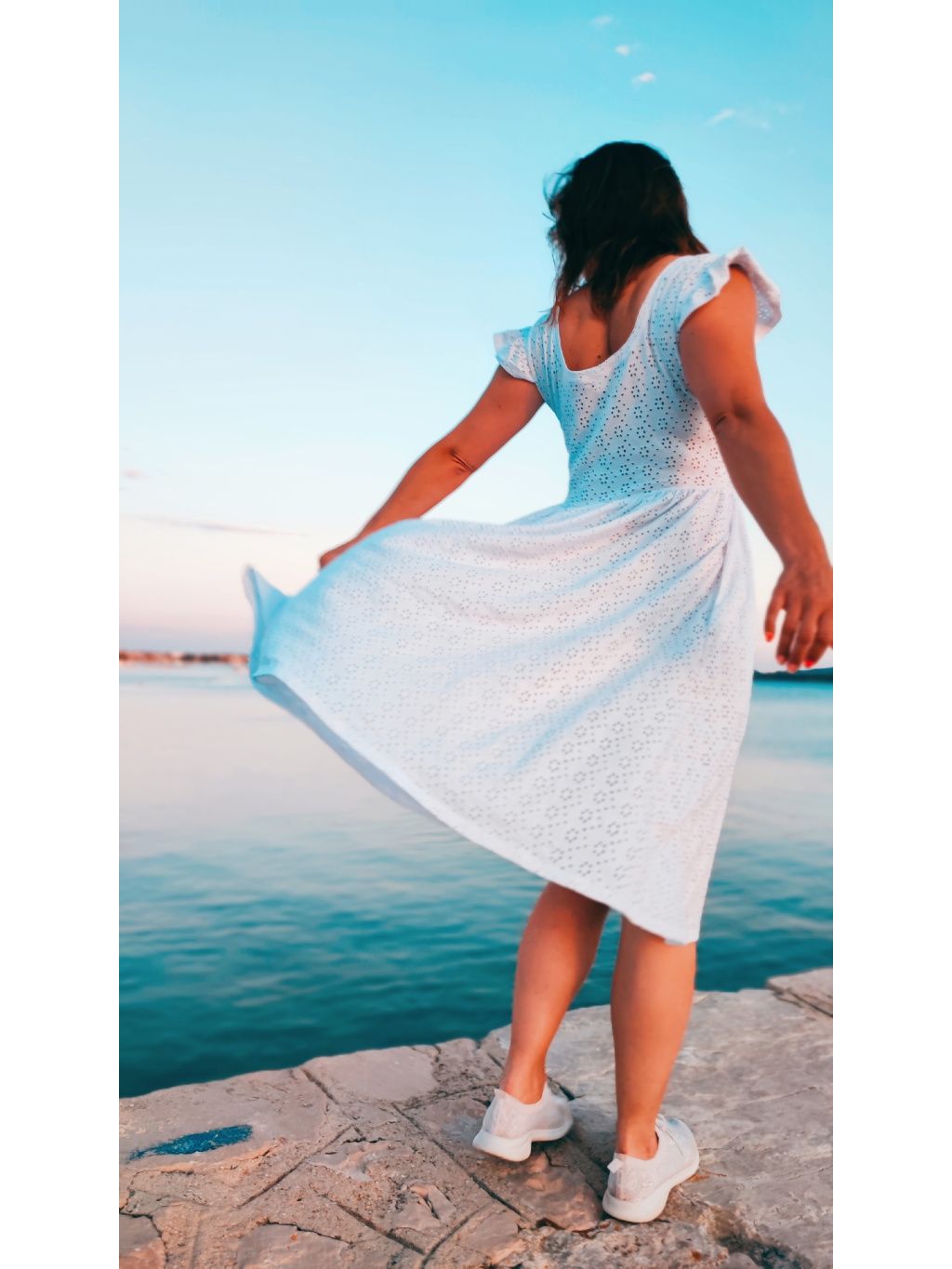 Šaty mají něžný motýlkový rukáv. Výstřih kulatý a praktické kapsy, které jsou důmyslně skryté v bočním švu, avšak nijak nerozšiřují. Úzký živůtek a široká nabraná sukně krásně zvýrazní ženskou siluetu a skryje menší bříško. Tyto jsem ozvláštnila svůdným hlubokým výstřihem na zádech. Vpředu na živůtku je bílá krajka.