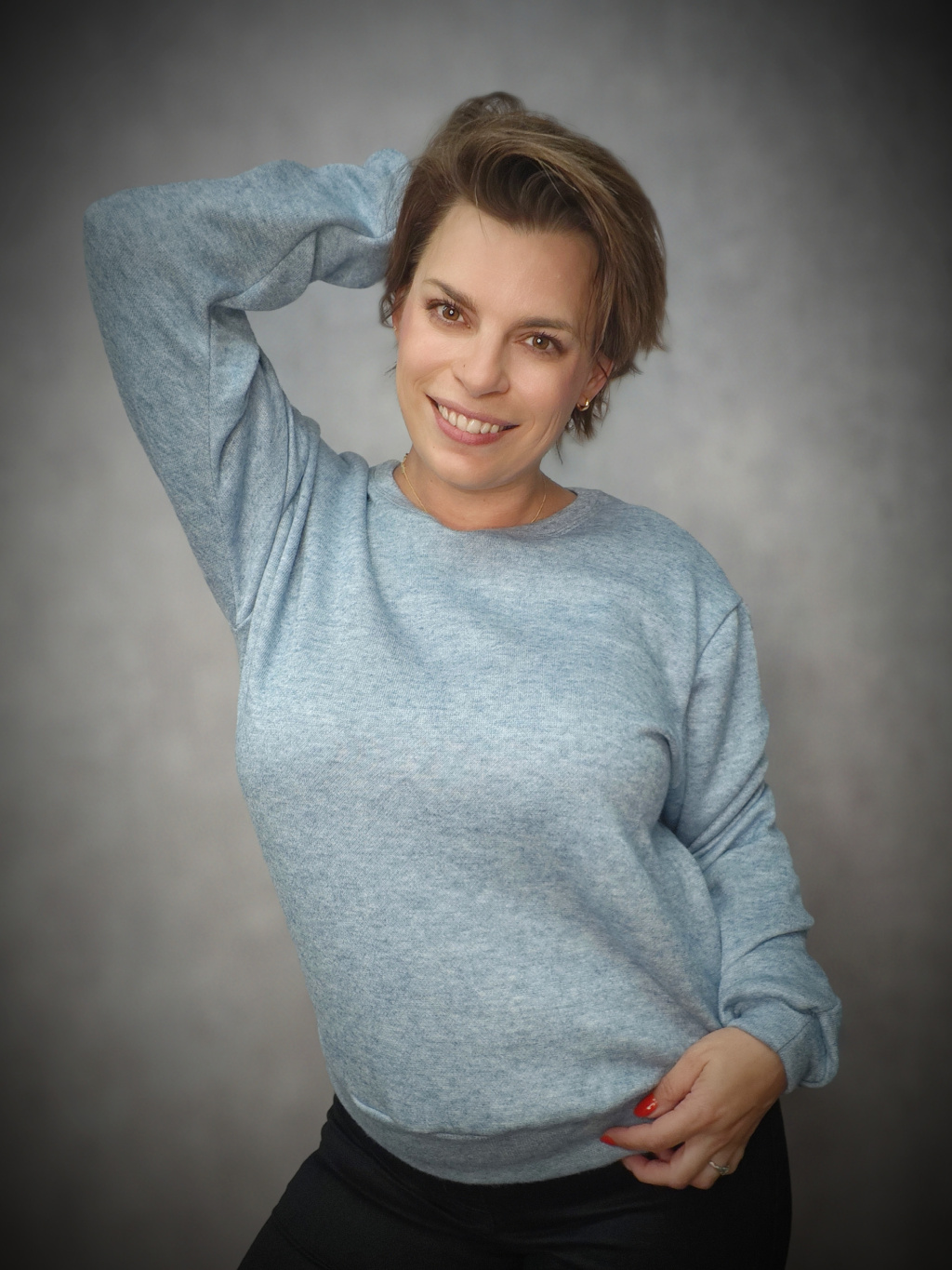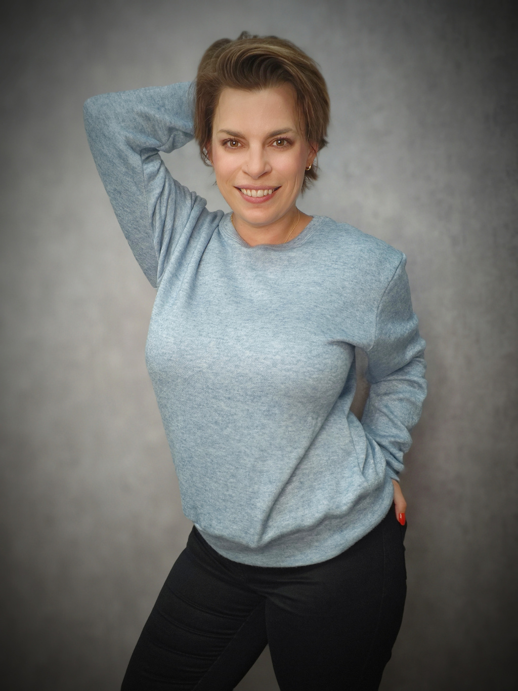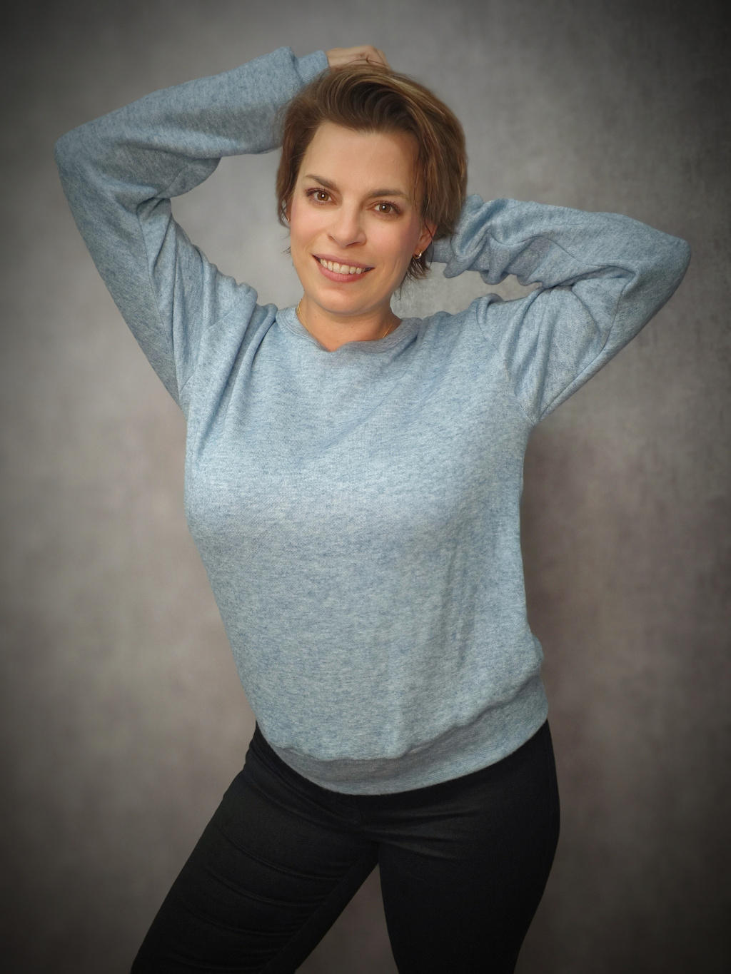 Střih svetříku je volnější s mírně spadlými rukávy. Lemy trička jsou do pružného nápletu.