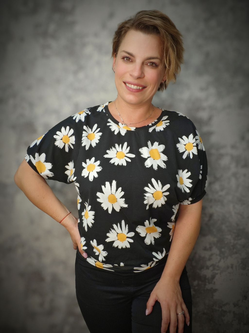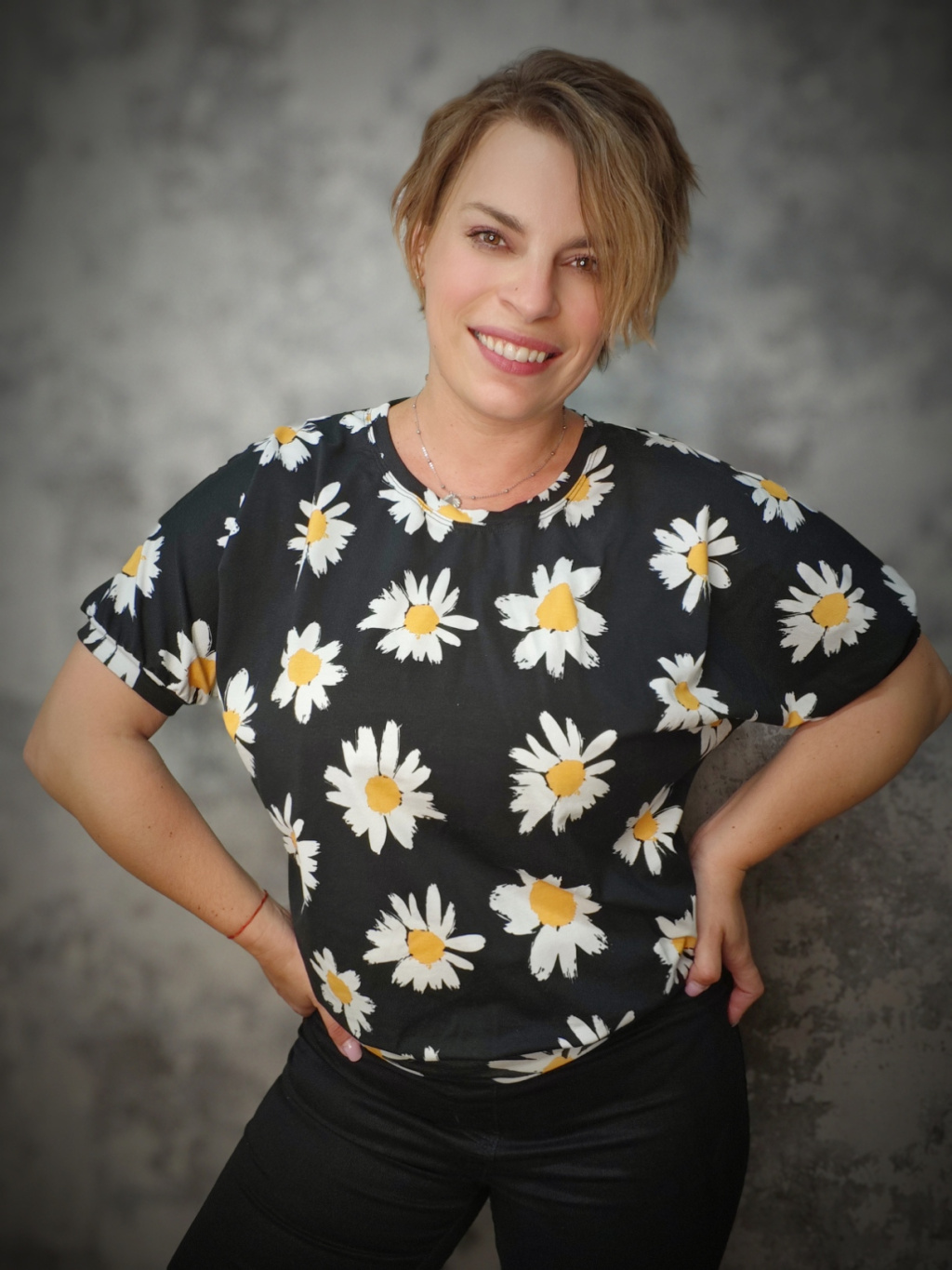 Střih trička s netopýřím rukávem vychází z oblíbeného JustOver trika, je mírně projmuté v průramcích, rukávky jsou do pružného lemu. Spodní díl trička je do pružného pásku.