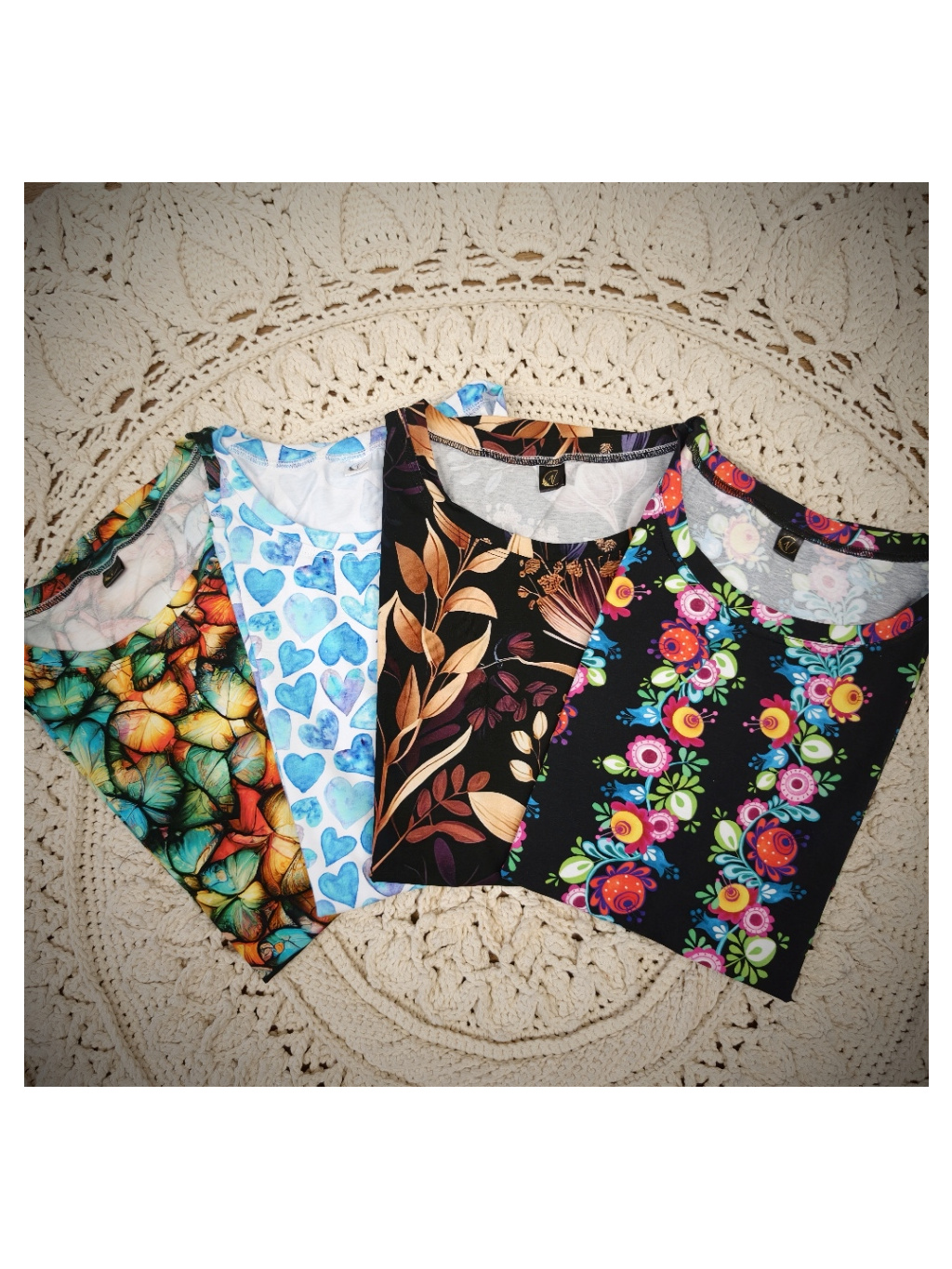 Pozn. Je to digitální tisk tmavý na světlém podkladu, proto doporučuji praní nejlépe v ruce, nebo v pračce naruby na málo otáček. Čím jemnější praní bude (bez odírání látky o sebe), tím déle vám vydrží krásné. Bílý chloupek, který se vytvoří po nešetrném vyprání je standardní chování digi tisku a není důvodem k reklamaci.