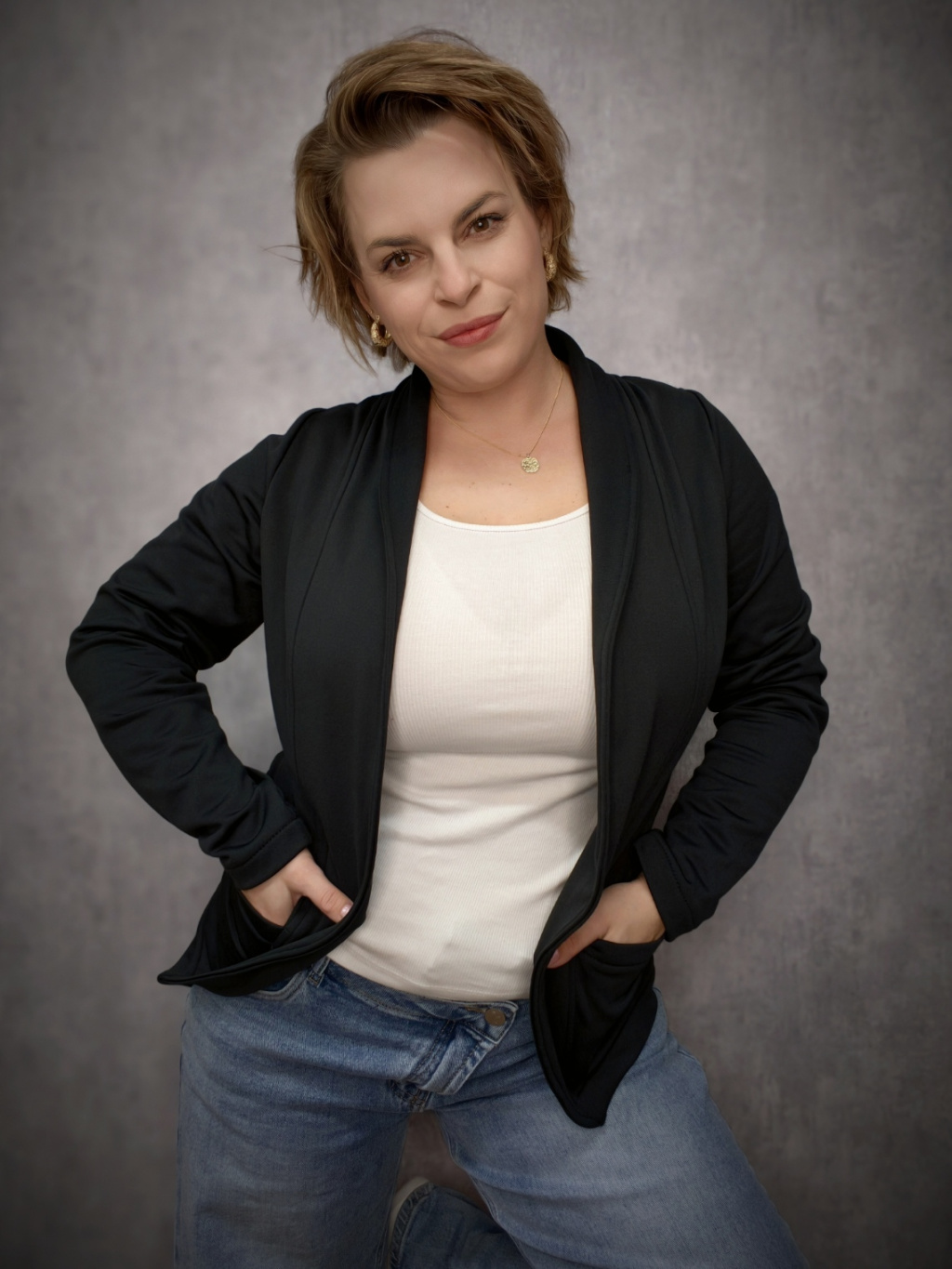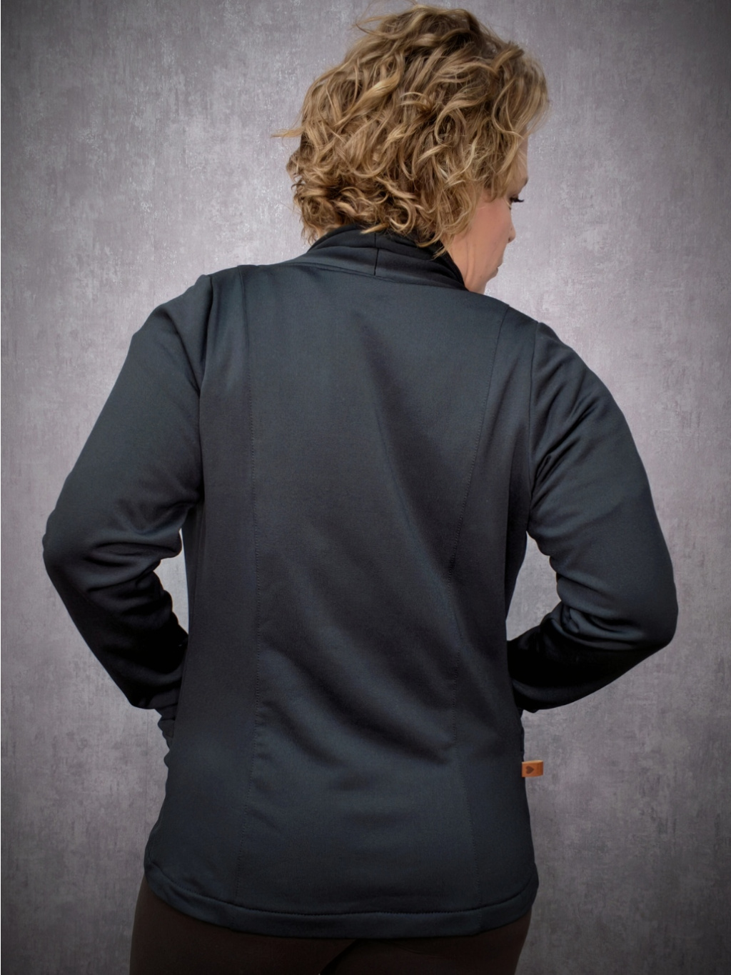 Měkký materiál s jemným chloupkem v rubu, střih bez zapínání, kapsy a délka k bokům.