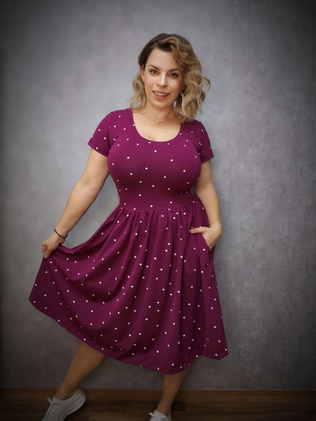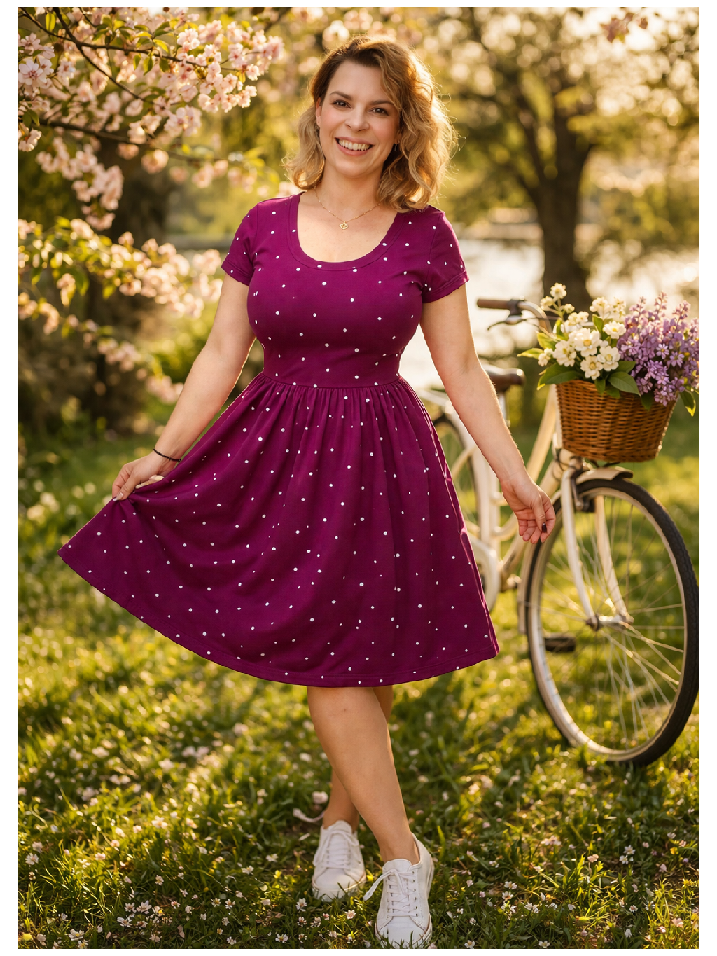 Širší řasená sukně zamaskuje menší bříško a ve spojení s úzkým živůtkem krásně zvýrazní ženskou siluetu. Šaty mají krátký rukáv, vpředu kulatý výstřih a praktické kapsy, které jsou důmyslně skryté v bočním švu, avšak nijak nerozšiřují. Oproti klasickým BeChic mají delší živůtek a bohatší, širší sukni, která vytváří krásný kontrast s úzkým pasem.