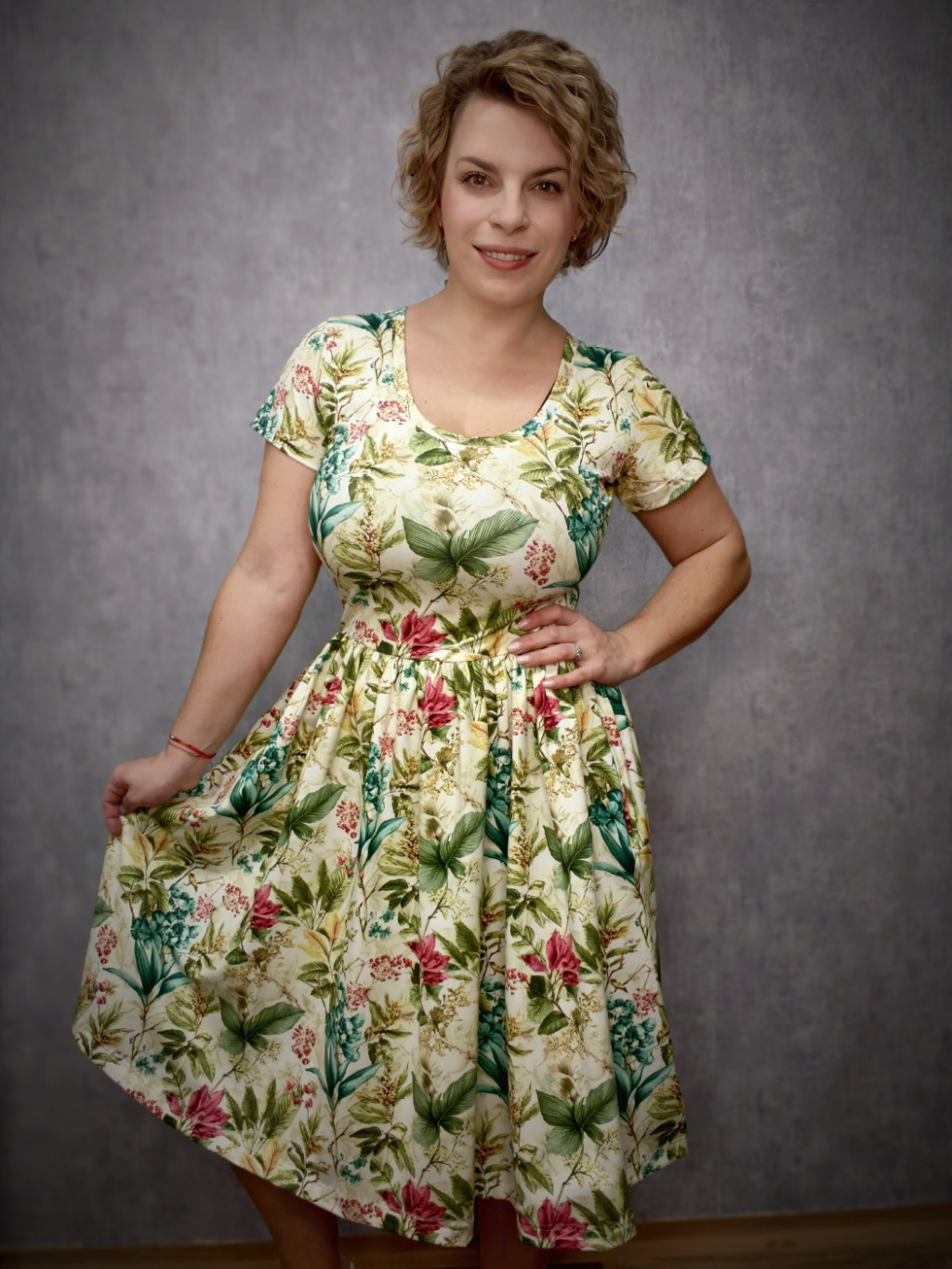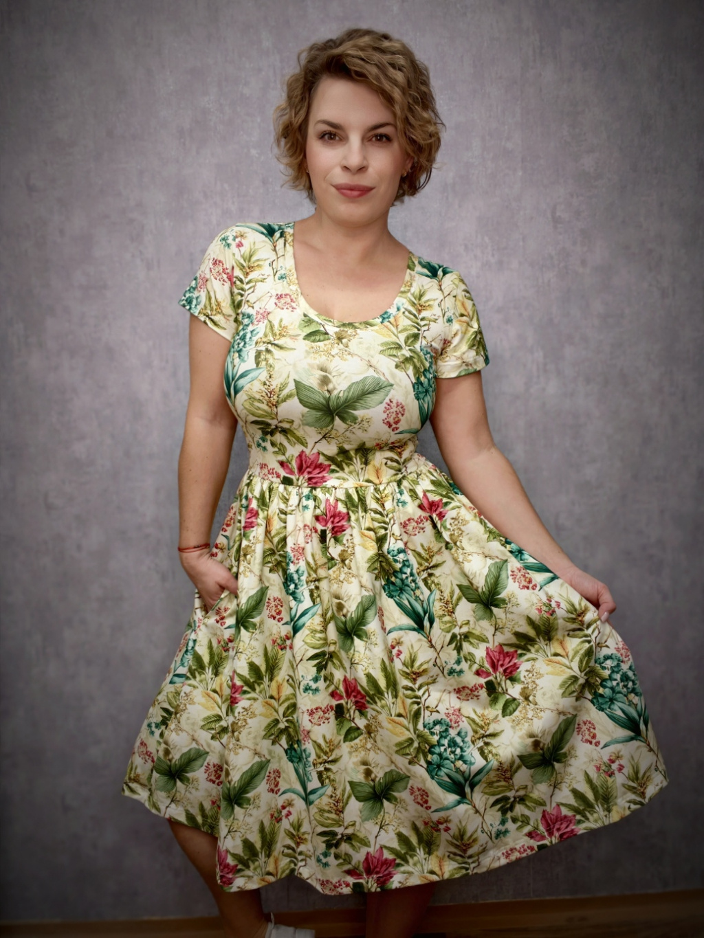 Širší řasená sukně zamaskuje menší bříško a ve spojení s úzkým živůtkem krásně zvýrazní ženskou siluetu. Šaty mají krátký rukáv, vpředu kulatý výstřih a praktické kapsy, které jsou důmyslně skryté v bočním švu, avšak nijak nerozšiřují. Oproti klasickým BeChic mají delší živůtek a bohatší, širší sukni, která vytváří krásný kontrast s úzkým pasem.