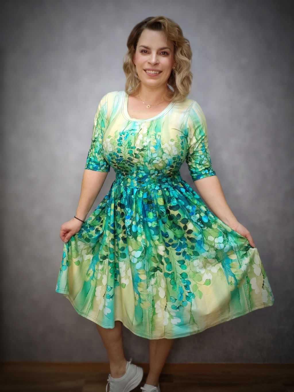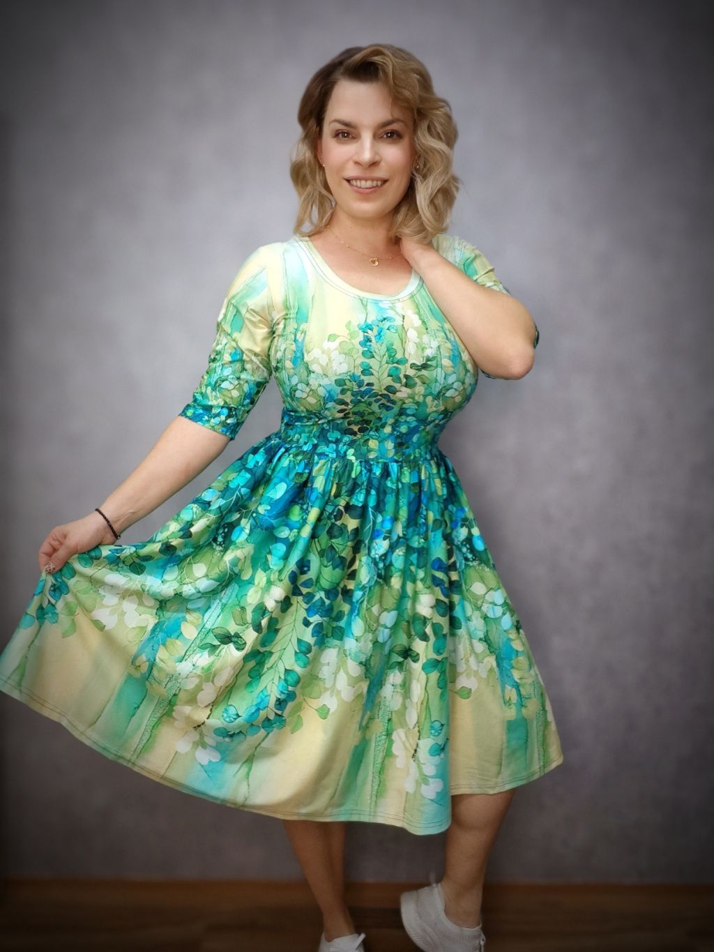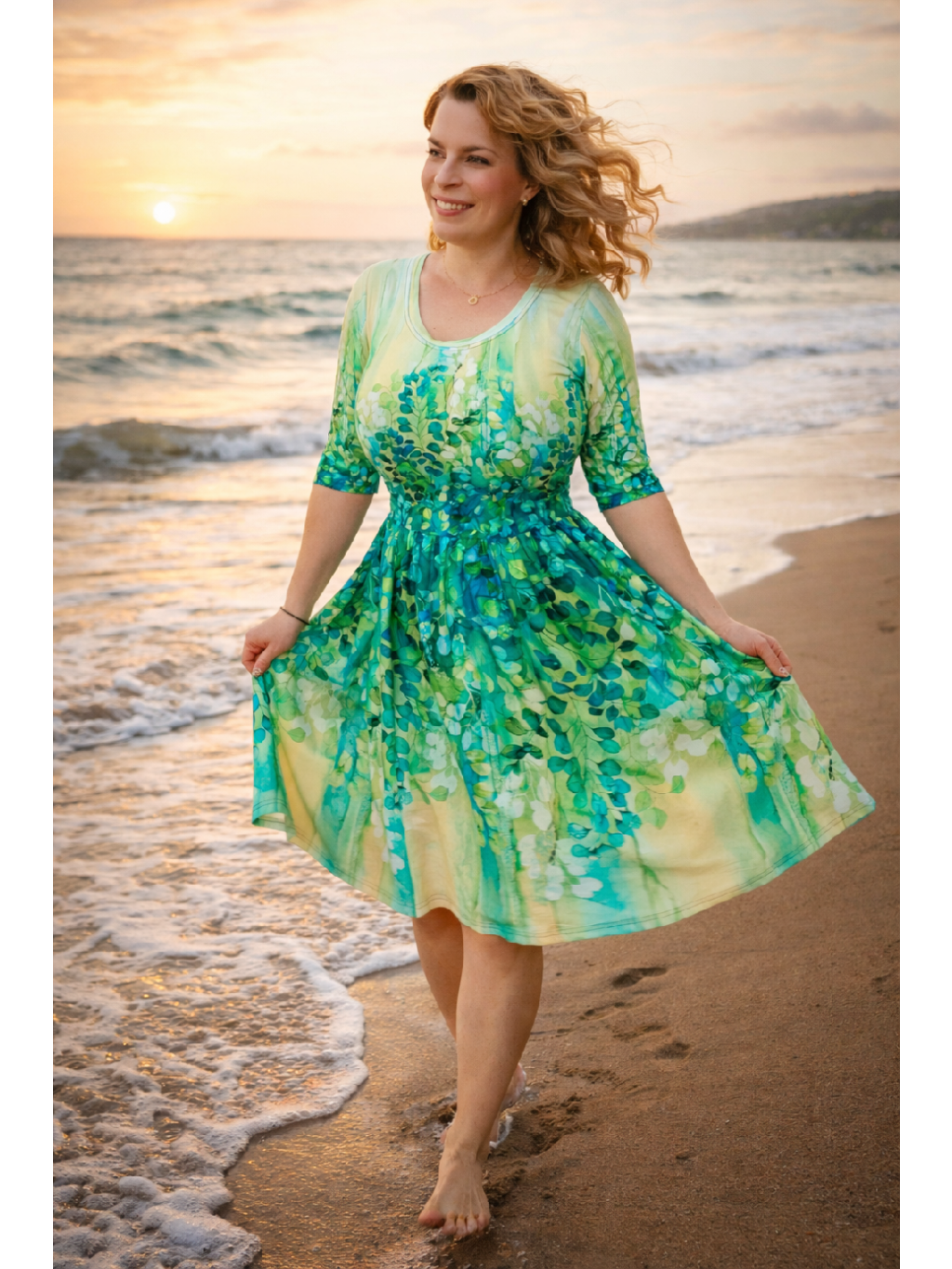 Širší řasená sukně zamaskuje menší bříško a ve spojení s úzkým živůtkem krásně zvýrazní ženskou siluetu. Šaty mají polodlouhý rukáv, vpředu kulatý výstřih a praktické kapsy, které jsou důmyslně skryté v bočním švu, avšak nijak nerozšiřují. Oproti klasickým BeChic mají delší živůtek a bohatší, širší sukni, která vytváří krásný kontrast s úzkým pasem.