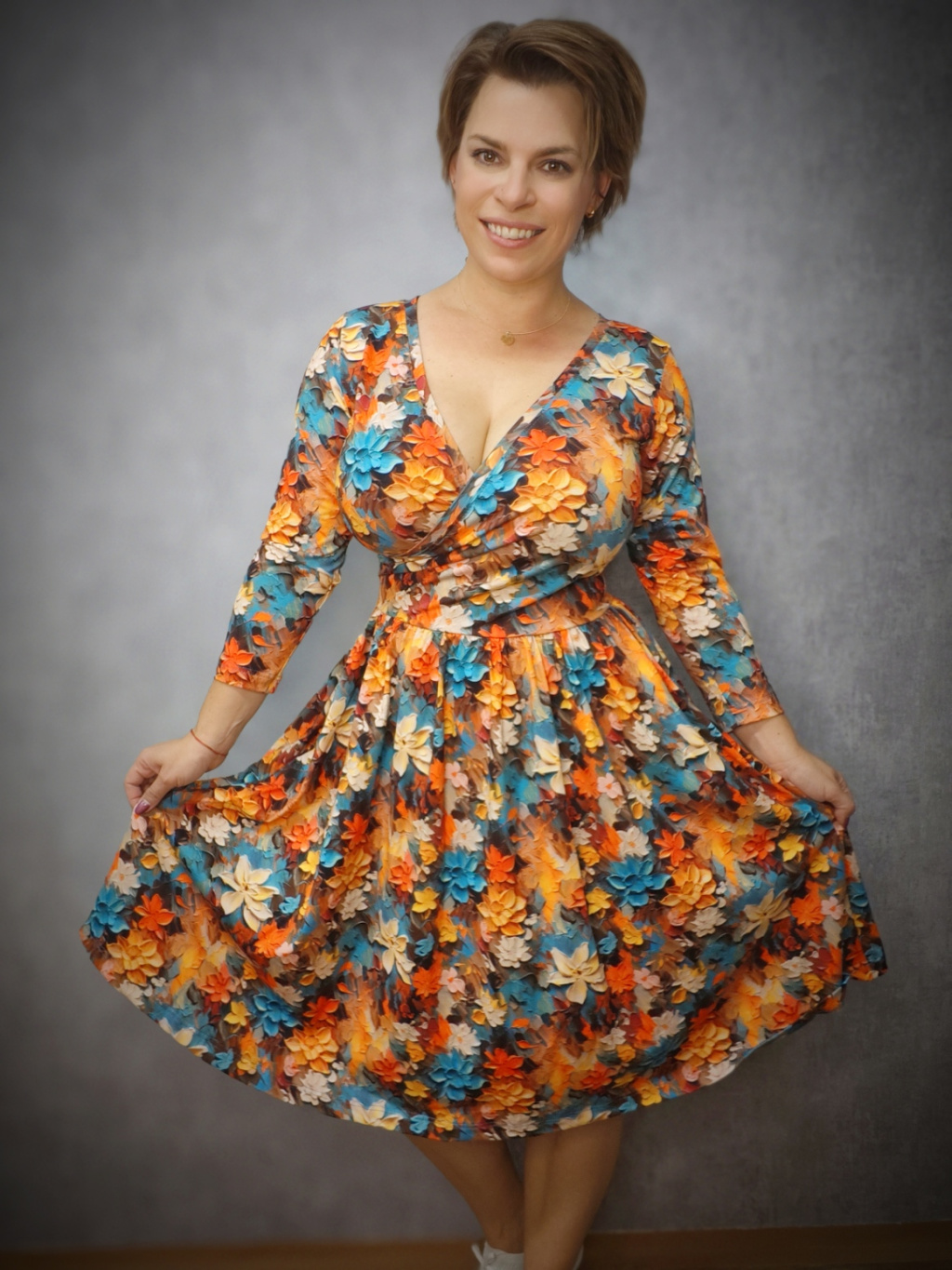 Střih šatů vychází z oblíbených BeChic+. Širší řasená sukně zamaskuje menší bříško a ve spojení s úzkým živůtkem krásně zvýrazní ženskou siluetu. Šaty mají 3/4 rukáv, vpředu výstřih v zavinovacím vzhledu, díky kterému můžete i pohodlně nakojit své mrně. Praktické kapsy, které jsou důmyslně skryté v bočním švu, avšak nijak nerozšiřují. Šaty mají bohatší sukni jako BeChic+, která vytváří krásný kontrast s úzkým pasem.
