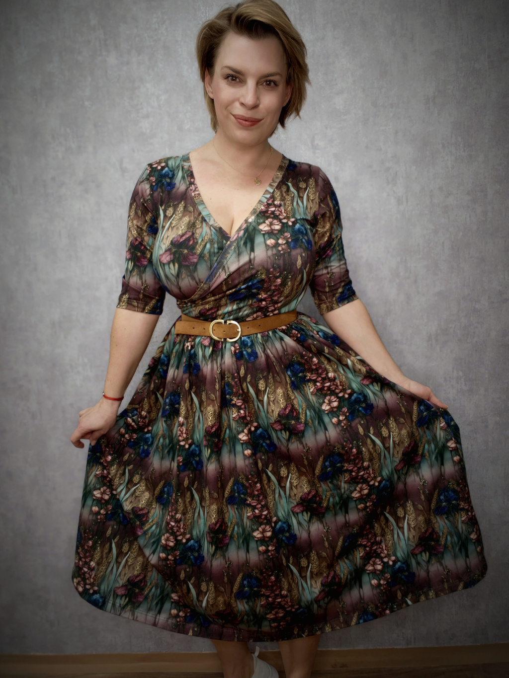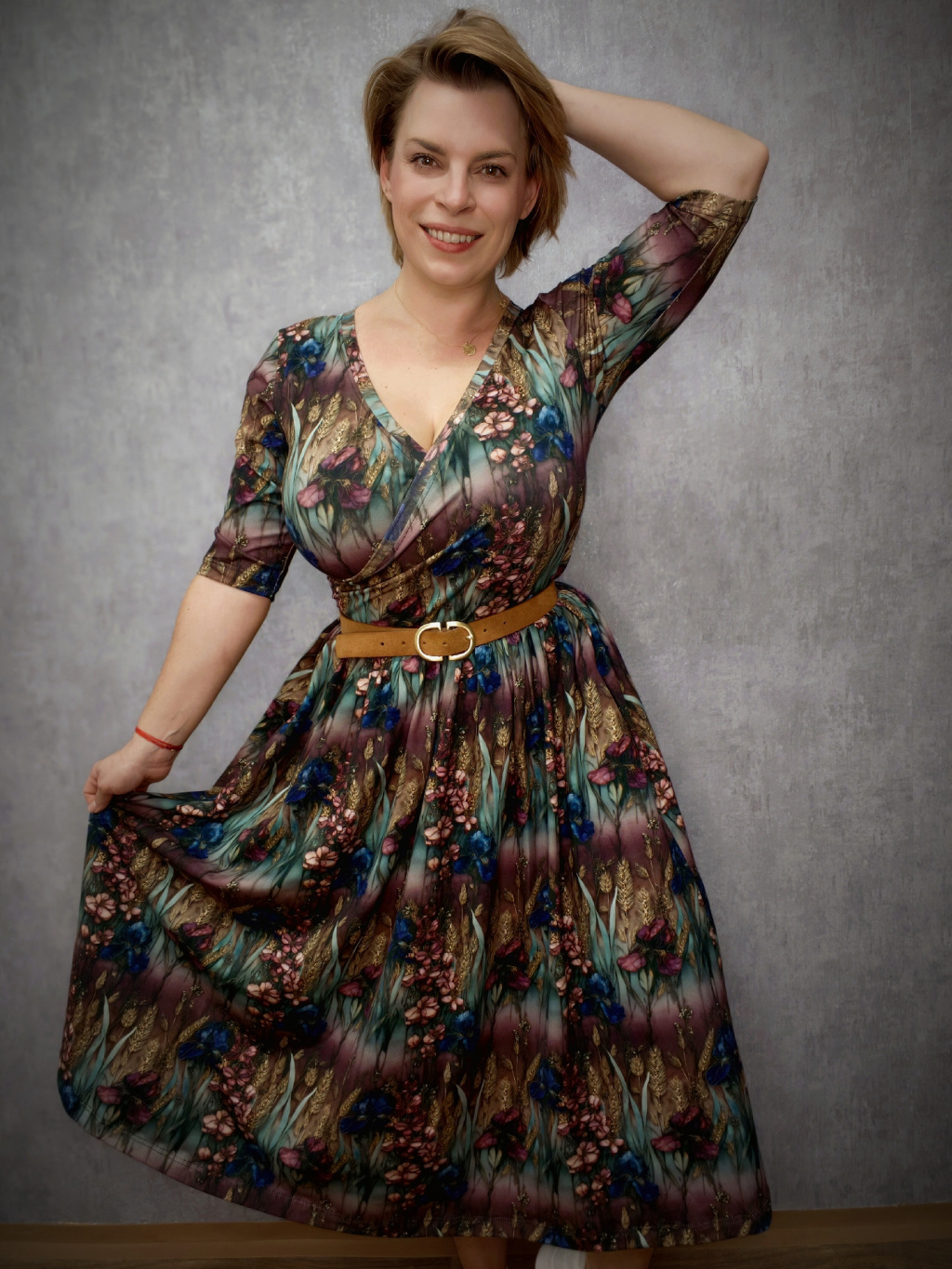 Střih šatů vychází z oblíbených BeChic+. Širší řasená sukně zamaskuje menší bříško a ve spojení s úzkým živůtkem krásně zvýrazní ženskou siluetu. Sukně je prodloužená. Šaty mají 3/4 rukáv, vpředu výstřih v zavinovacím vzhledu, díky kterému můžete i pohodlně nakojit své mrně. Praktické kapsy, které jsou důmyslně skryté v bočním švu, avšak nijak nerozšiřují. Šaty mají bohatší sukni jako BeChic+, která vytváří krásný kontrast s úzkým pasem.
