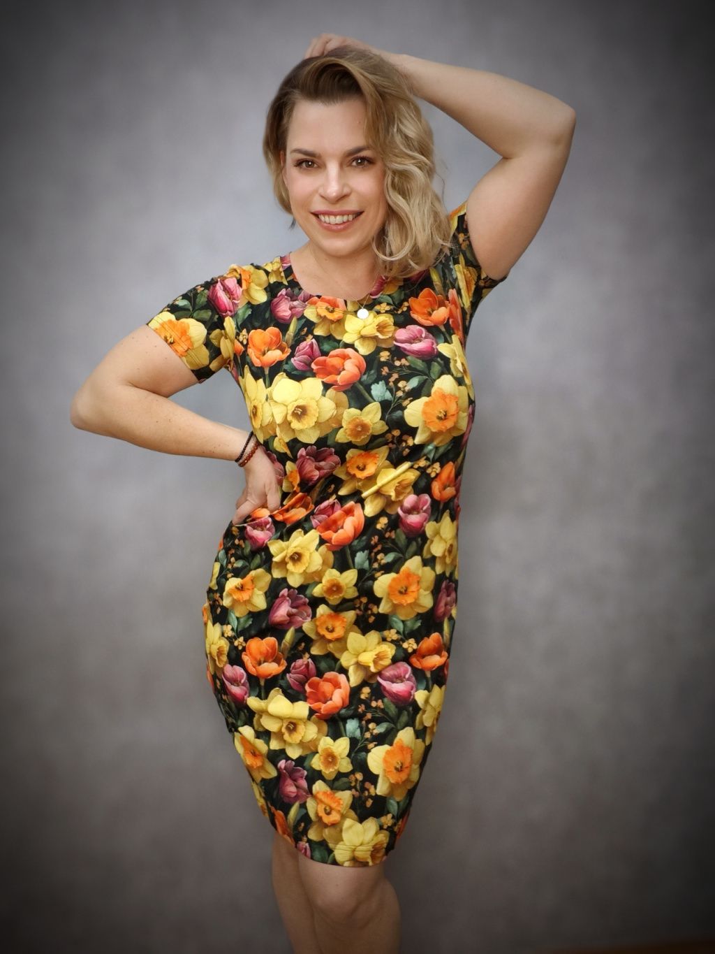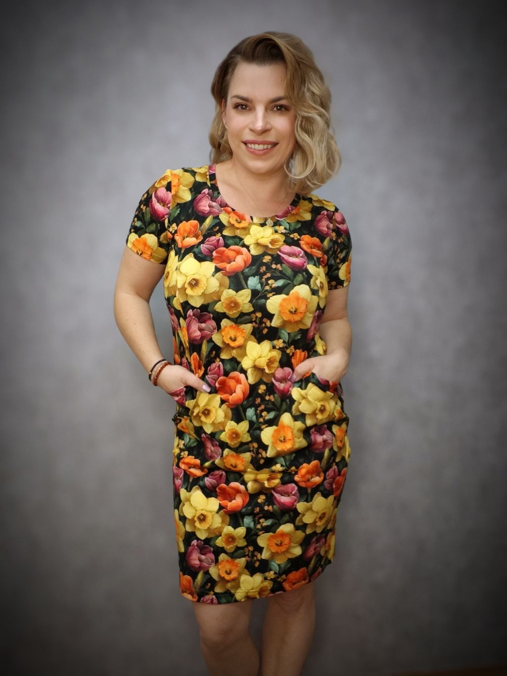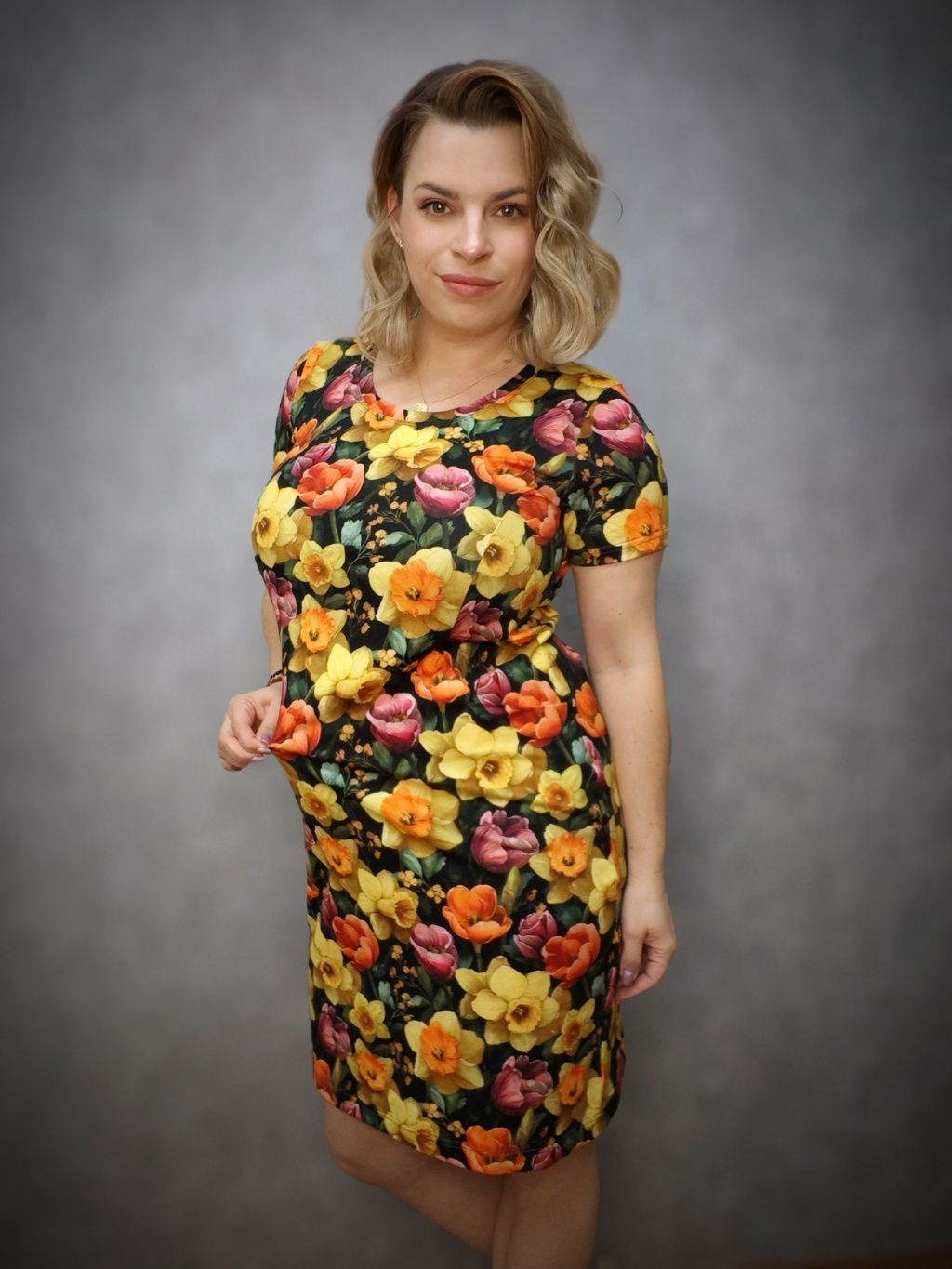 Šaty mají krátký rukáv, volnější střih (mírně oversize, zejména v oblasti bříška) a praktické kapsy poslouží k ležérnějšímu nošení. Díky kapsám v předním dílu a typu střihu šaty také opticky zužují.