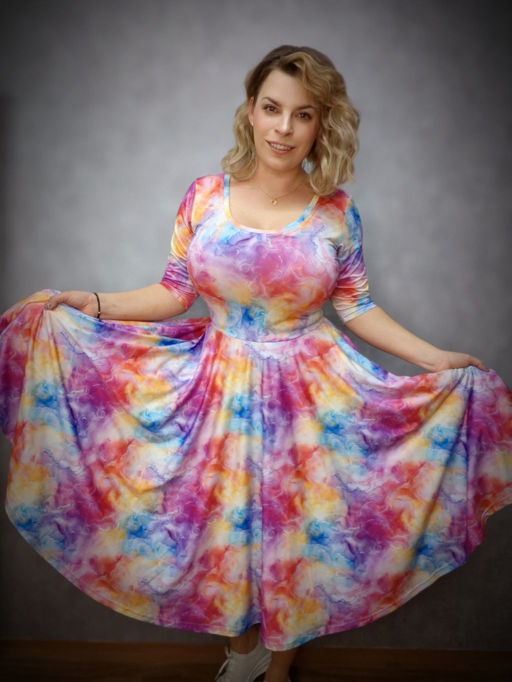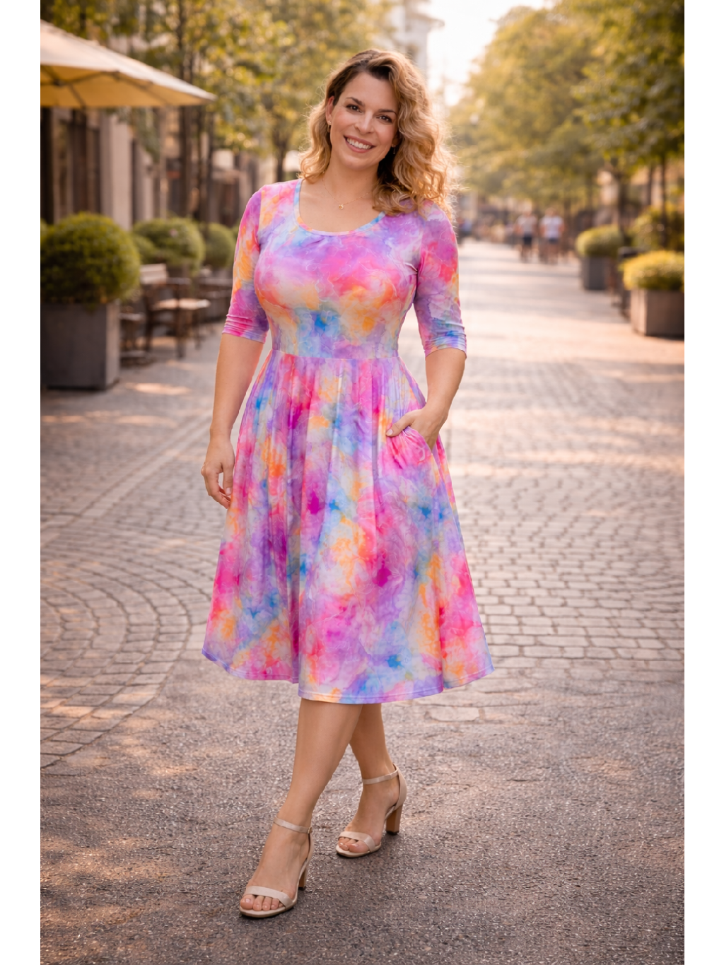 Šaty mají poloviční rukáv, kulatý výstřih a praktické kapsy, které jsou důmyslně skryté v bočním švu, avšak nijak nerozšiřují.