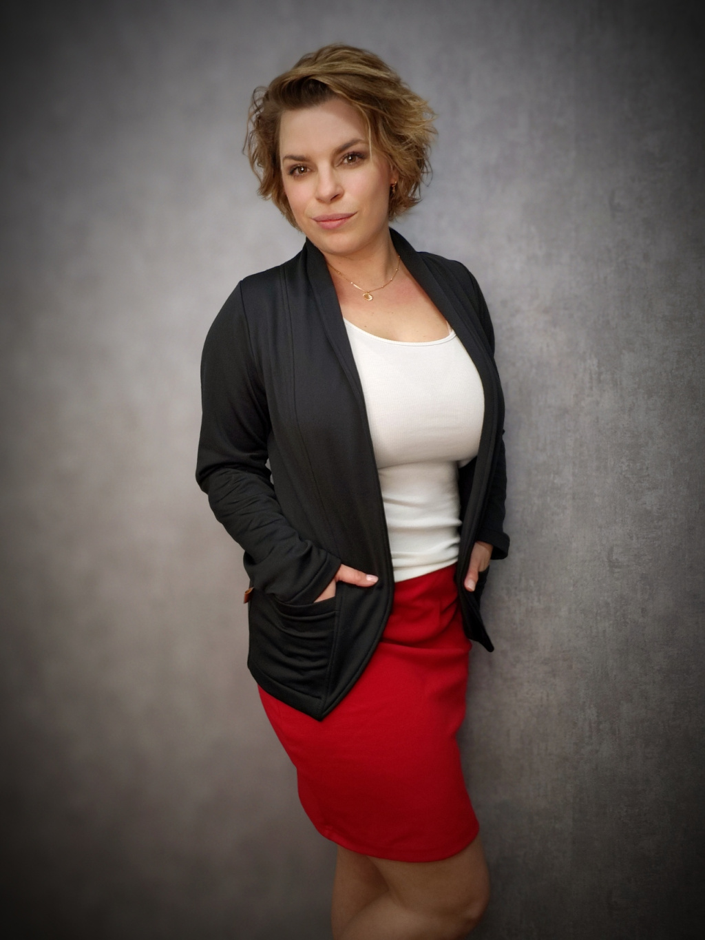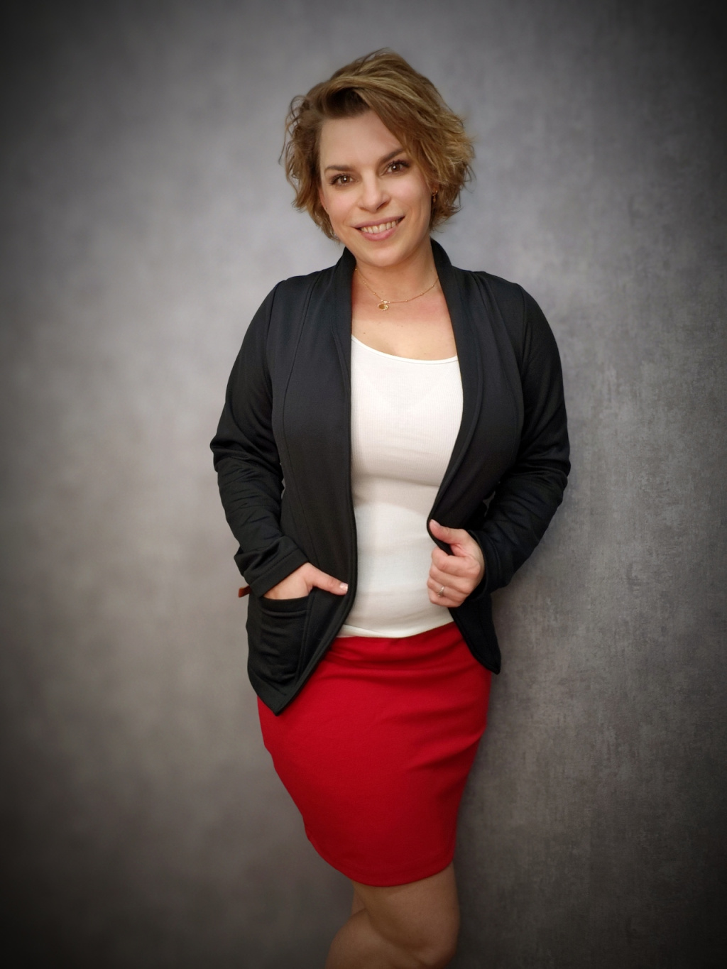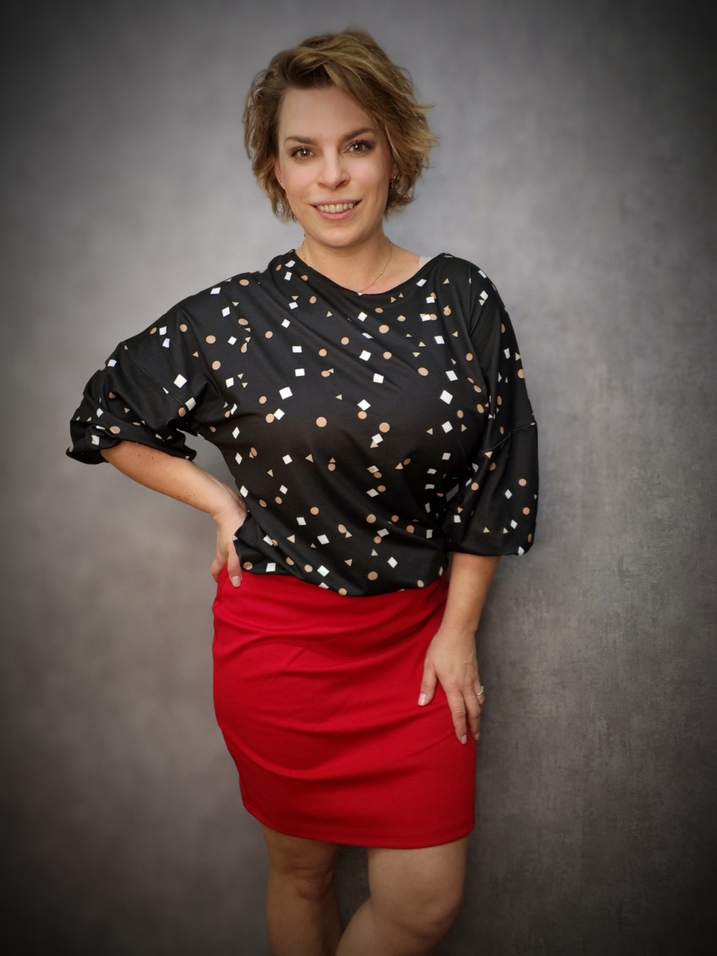 Ušitá je ze elegantního punto úpletu, který krásně drží tvar a zároveň je velmi pohodlný. Díky gumě v pase se snadno obléká a nikde netlačí.